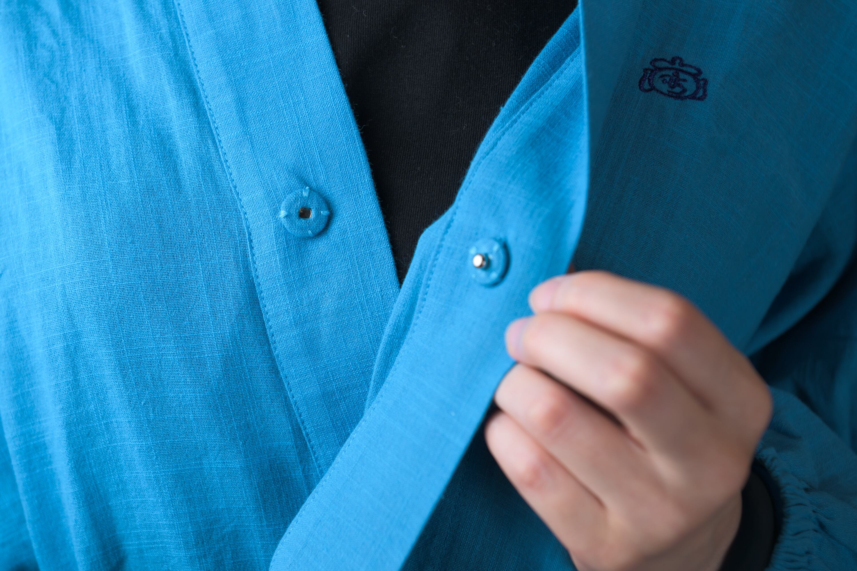 新たな試みとして、胸元にスナップ釦を付けました。