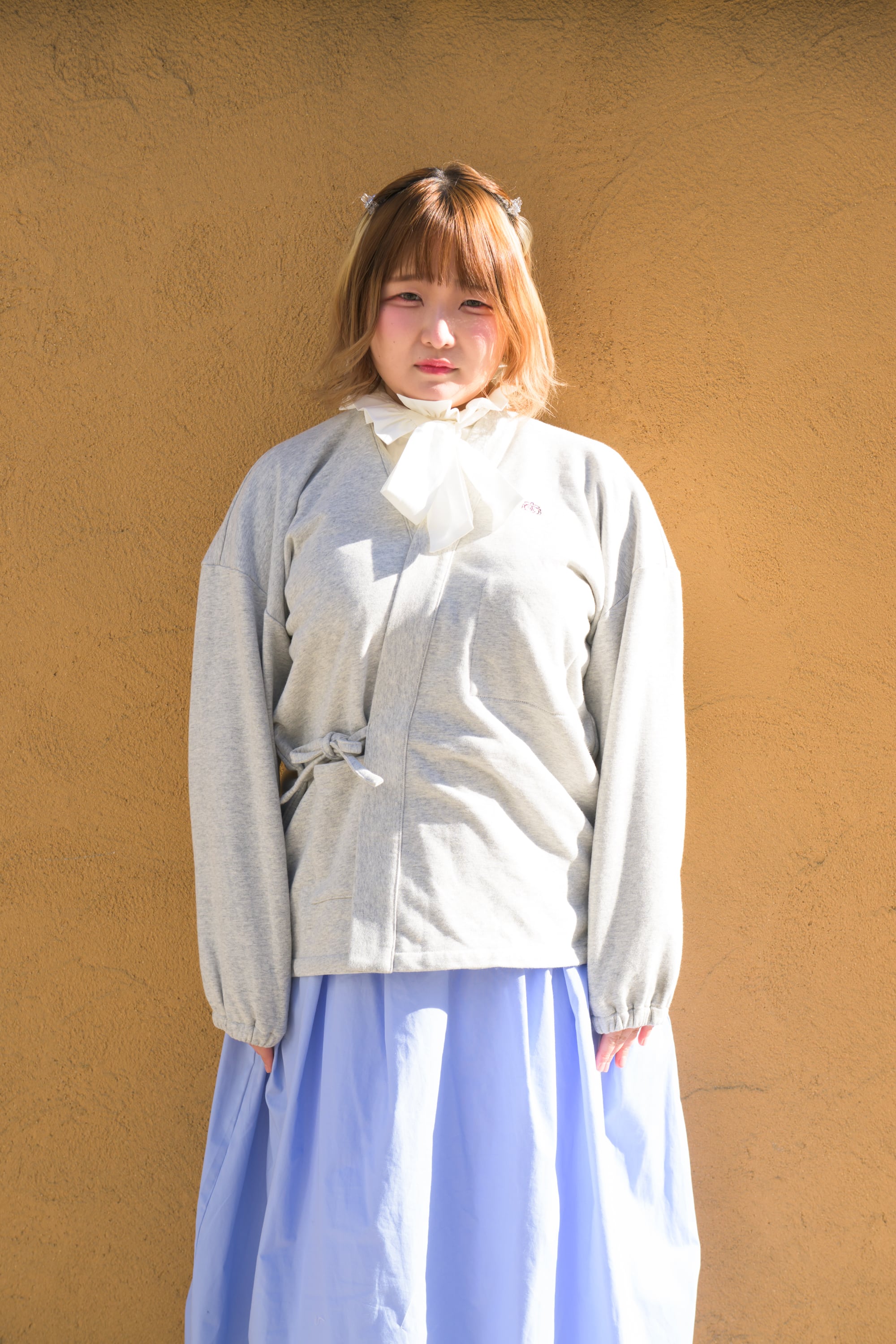 ウェストを紐で2箇所縛って着用しますが、あえて縛らずに羽織るだけのスタイリングもおすすめ。