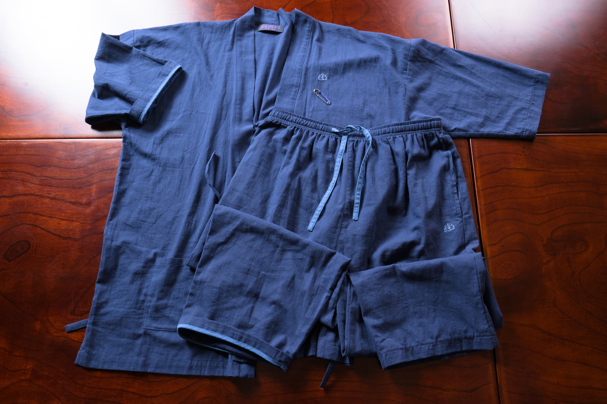 ブランドスタート時から使い続けている薄手の定番生地、みほとけのロゴが入ったオリジナル 作務衣。